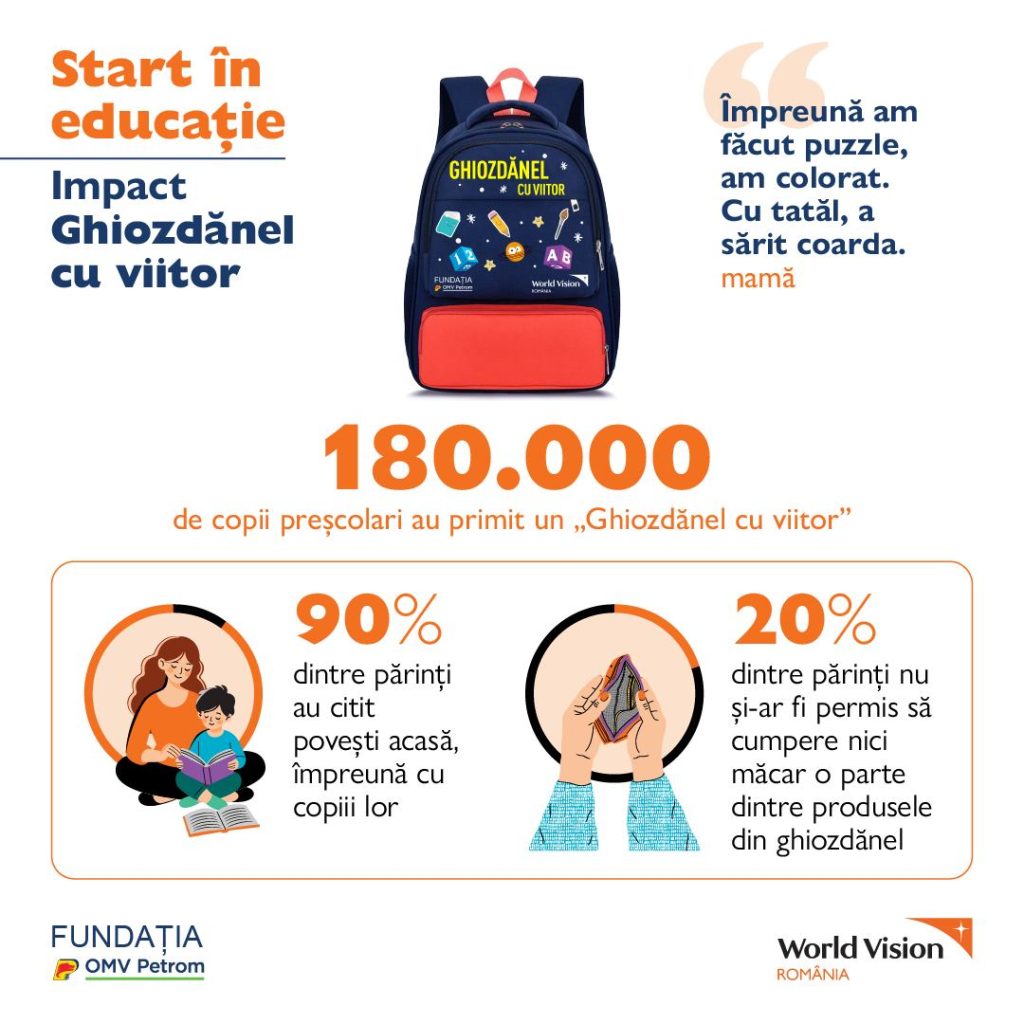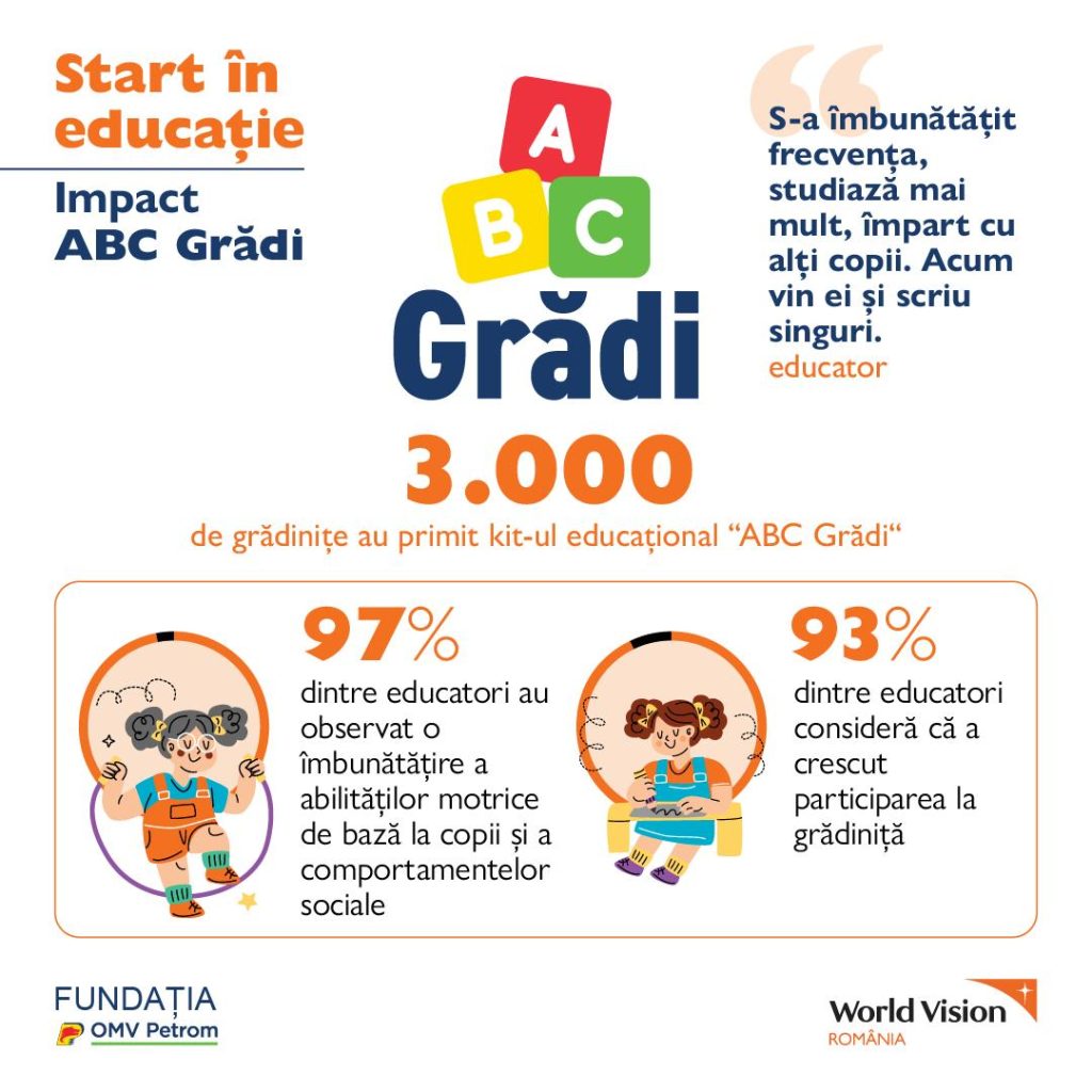 Proiectul derulat de Fundația OMV Petrom și Fundația World Vision Romania are impact asupra calității educației timpurii, contribuie la creșterea ratei de participarea a copiilor la activitățile din grădiniță și consolidează continuitatea învățării acasă: